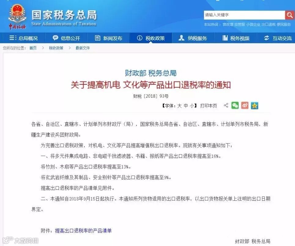 9月5日,国家财政部和税务总局联合发布了《关于提高机电、文化等产品出口退税率的通知》!这397类商品,如果海关报关单申报日在9月15日(含)之后,将能享受到新的退税率优惠!