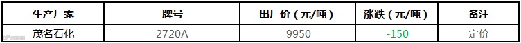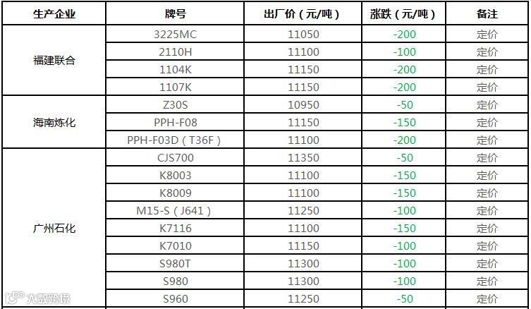 中化泉州炼厂PP价格下调50元/吨:其中L5E89报价在11050元/吨福建送到,L5E89-GD暂停报价,L5D98暂停报价,LH7714-12暂停报价,H5380R-1暂停报价吨。此外,潮汕地区送到需加50元/吨运费。