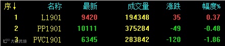 PVC主力1901合约又双叒叕创新低了,本周连续5个交易日时间,V1901合约持续刷新低点。PP方面也难言乐观,虽昨日以来的反弹持续到今日,但午后期价减仓下跌,最后以最低价收盘。塑料短期跌势有所放缓,今日微幅上涨,收取两连阳。具体来看:V1901收6345跌120或1.86%。;PP1901收10111跌49或0.48%;L1901收9420涨35或0.37%。