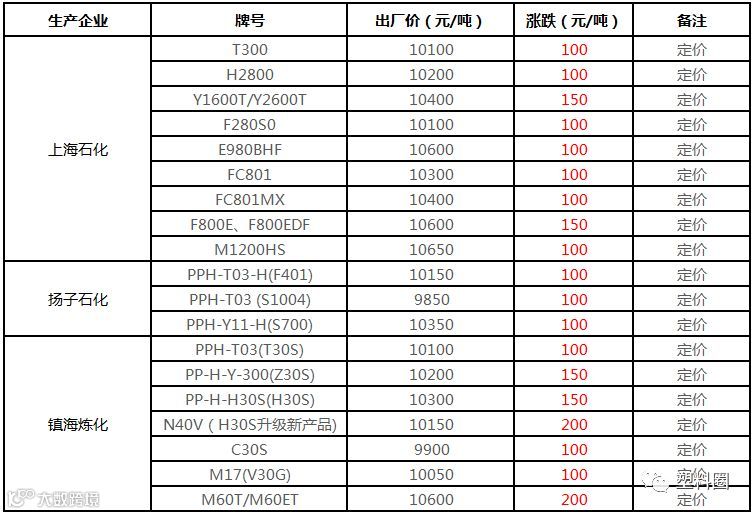 中石化华东PP最新定价上调100-200元/吨!!!
