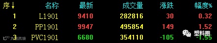 塑料相关品种期货走势分化:塑料主力合约震荡小涨,收取4连阳;PVC1901增仓下行,盘中再创近期新低;多头王者归来,PP主力合约吸金上涨。具体来看:塑料1901收9410涨30涨幅0.32%;V1901收6680跌105跌幅1.55%;PP1901收9947涨149涨幅1.52%。
