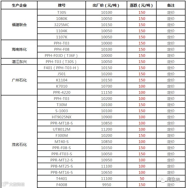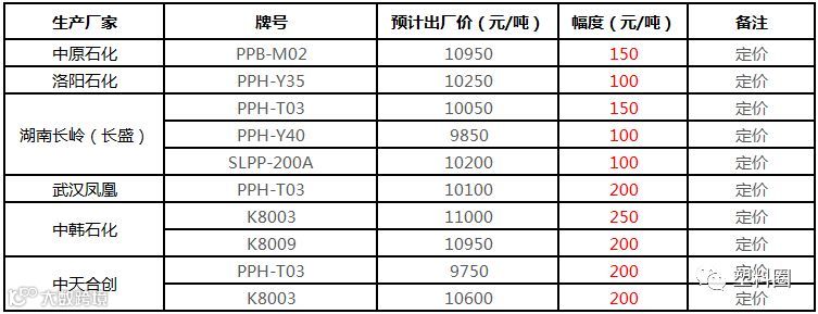 中石化华南PP最新定价上调50-150元/吨!!!