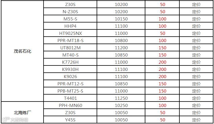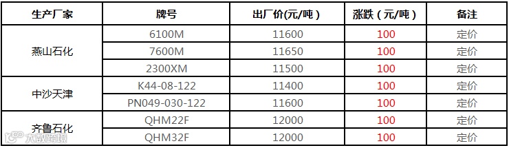 中化泉州炼厂PP价格小幅上涨:其中L5E89报价涨50元/吨至10150元/吨福建送到,L5E89-GD报价涨50元/吨至10100元/吨福建送到,L5D98暂停报价,H5250R暂停报价,LH7714-12暂停报价,H5380R-1福建送到价上在10300元/吨。此外,潮汕地区送到需加50元/吨运费。