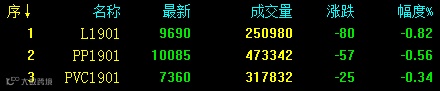 空头增仓打压,今日塑料相关品种期货滞涨转跌。具体来看:塑料1901收9690跌80,跌幅0.82%;,V1901收7360跌25,跌幅0.34%;PP1901收10085跌57,跌幅0.56%。