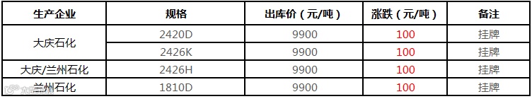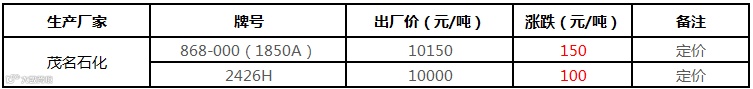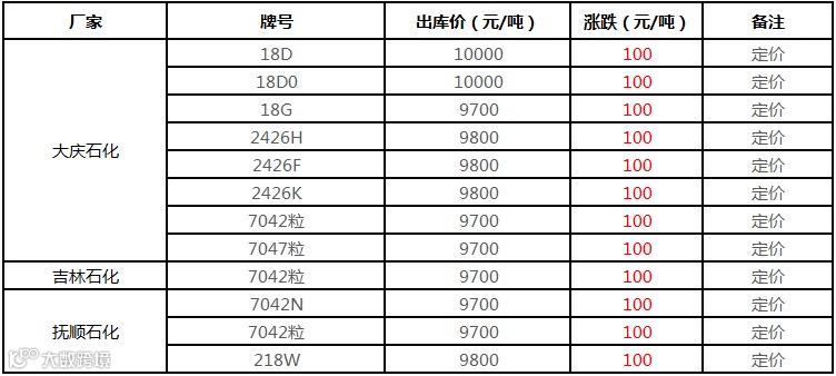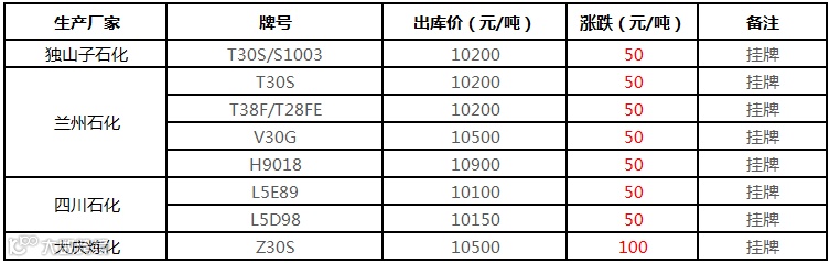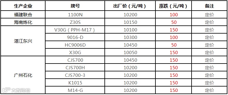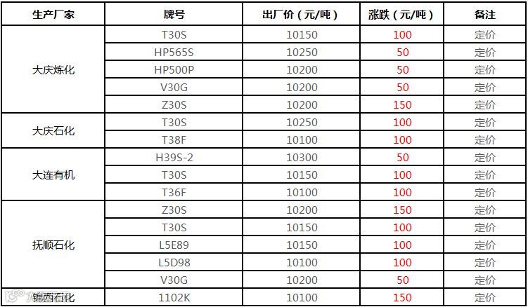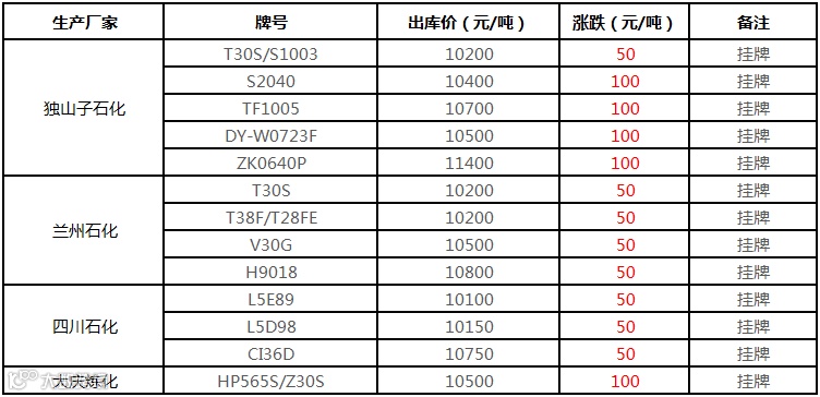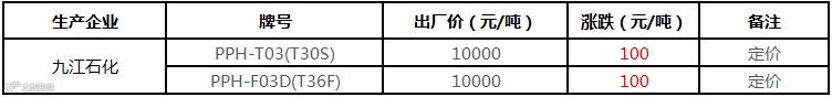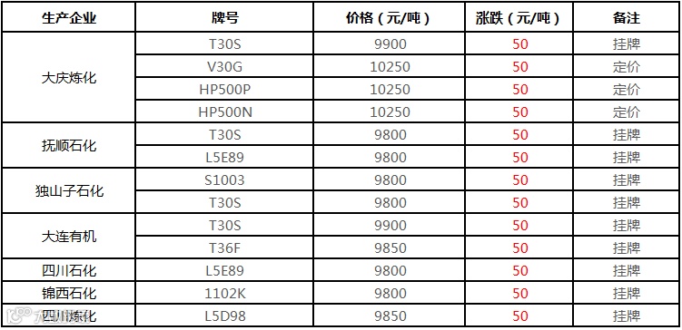 目前厂家聚丙烯产品价格上涨50元/吨:T30S报价10000元/吨,Z30S报价在10050元/吨,H30S报价10100元/吨。