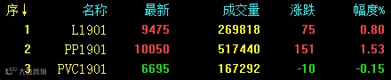 主力持续拉涨,PP期货重上万元关口,主力1901合约收取4连阳。具体来看:塑料1901收9475涨75涨幅0.80%;V1901收6695跌10跌幅0.15%;PP1901收10050涨151涨幅1.53%。