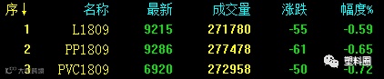 今日塑料相关品种均高开下跌,以中阴线收盘。其中线性期货空头增仓明显,PP与PVC主力合约均有明显减仓。截止下午收盘L1809跌5收9215,跌幅0.59%;PP1809跌61收9286,跌幅0.65%;PVC1809跌50收6920,跌幅0.72%。
