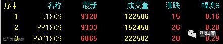 止跌反弹,塑料相关品种期货减仓小涨。具体来看:塑料1809收9320涨15,涨幅0.16%;V1809收6865涨20,涨幅0.29%;PP1809收9333涨26,涨幅0.28%。
