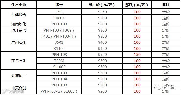 中化泉州炼厂PP价格全线上涨:其中L5E89上涨50元/吨至9250元/吨福建送到,L5E89-GD报价上涨50元/吨至9200元/吨福建送到,L5D98暂停报价,H5250R暂停报价,LH7714-12福建送到价上涨50元/吨至9300元/吨,H5380R-1福建送到价上涨50元/吨至9400元/吨。此外,潮汕地区送到需加50元/吨运费。