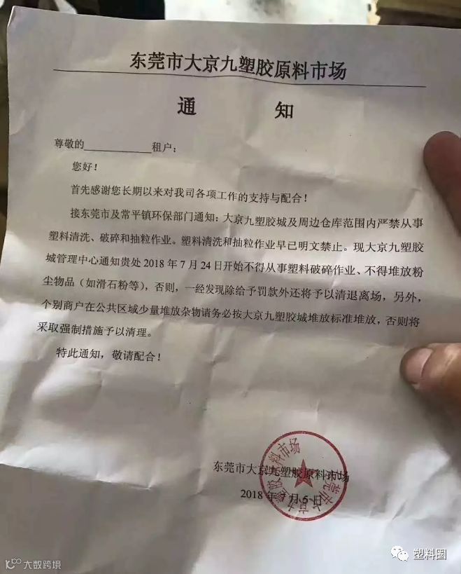 东莞著名的塑胶市场—大京九,更是直接发了通告,禁止从事塑料破碎、清洗、抽粒,不少企业被迫停业整顿!