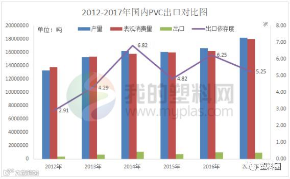 2017年底,全球聚氯乙烯(PVC)产能约为5800万吨,中国PVC产能达2379.5万吨,约占世界比重41%。而国内PVC企业对外出口量却很少,2017年累计出口量为95.7万吨,仅占国内产量的5.4%。