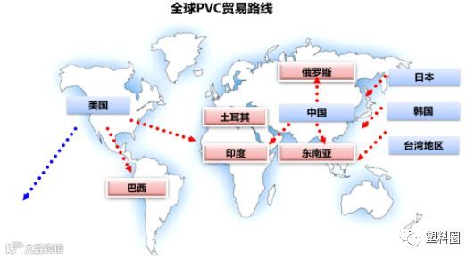 从全球PVC的贸易路线来看,输出国包括日本、韩国、中国台湾以及美国。消费地主要是拉美、南亚、东南亚一带。日本、韩国、台湾主要往中国、东南亚一带输出高端料、改性料等优质产品。而中国以价格低廉占据型材销往南亚、东南亚一带。美国因国内页岩气成本较低,产品质优价廉,对各个地区均有销售,但运输半径较大,运费不占优。
