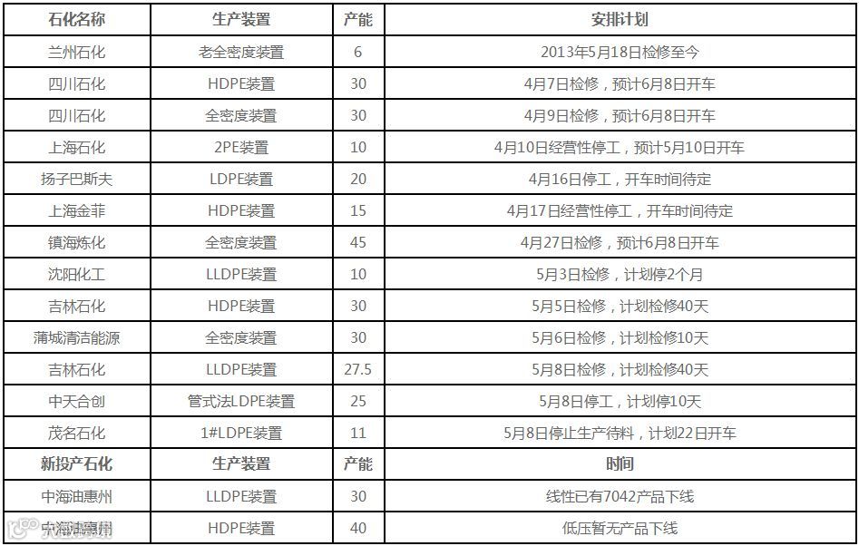 由上图可以看出,五一节前行情普遍整理,节后归来,由于煤化工装置产低压较多,线性资源偏少,市场报价小幅走高,以线性为主。月初华北LLDPE主流价格在9700元/吨左右;华东LLDPE主流价格在9600-9700元/吨左右;华南LLDPE主流价格在9600-9700元/吨左右。然而伴随着线性期货拉升,石化价格连续调涨,截止到目前,华北LLDPE主流价格涨至9900-9950元/吨左右;华东LLDPE主流价格在9950-10000元/吨左右;华南LLDPE主流价格在9900-10000元/吨左右;由此看出国内PE市场短短一周时间涨幅高达到200-300元/吨。以下为5月份检修装置及最新扩能装置详表: