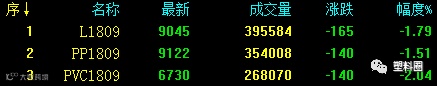 今日塑料相关品种期货合约整体下滑明显,其中PP1809及V1809资金流出明显,LL1809增仓回落。LL1809收盘跌165至9045,跌幅在1.79%;PP1809跌140至9122,跌幅1.51%;V1809跌140至6730,跌幅2.04%。