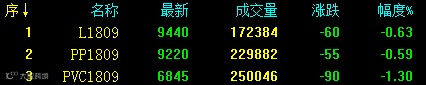 今日塑料市场期货主力合约均下跌。截止下午收盘,PP1809合约收盘价9220,下跌55,跌幅0.59%;L1809合约收盘价9440,下跌60,跌幅0.63%;V1809合约收盘价6845,下跌90,跌幅1.30%。