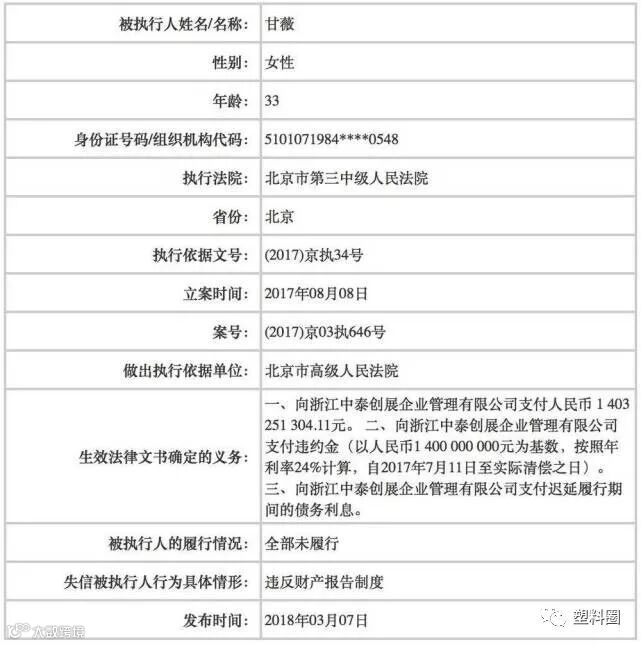 北京市第三中级人民法院3月7日发布的执行信息显示,甘薇应向浙江中泰创展企业管理有限公司(下称“浙江中泰创展”)支付14.03亿元,并支付按照年利率24%计算的违约金,以及迟延履行期间的债务利息,但其全部未履行,因此以违反财产报告制度情形被列为“失信被执行人”。