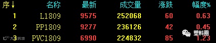 今日塑料相关品种震荡收涨,资金做多情绪浓厚。至下午收盘,连塑1809收盘涨60至9575,涨幅在0.63%;PP1809收盘涨42至9277,涨幅在0.45%;V1809收盘涨85至6990,涨幅在1.23%。