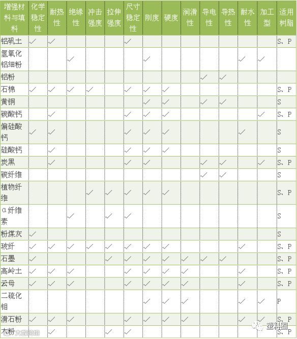 注:S-热固性塑料;P-热塑性塑料;√-有此方面的作用
