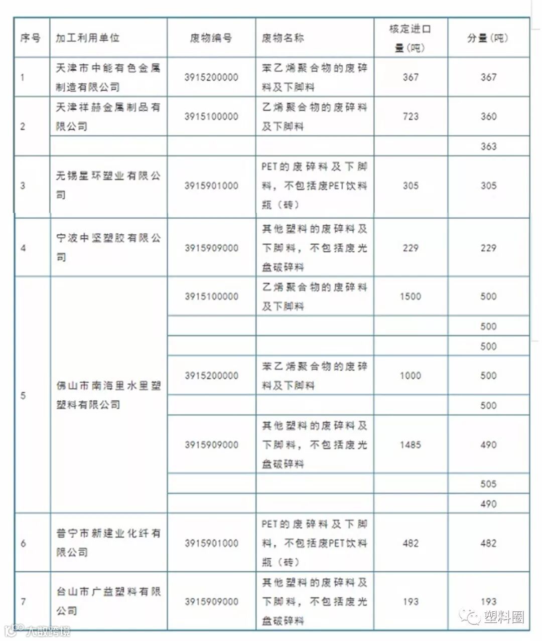 1月31日,2018年第5批建议批准的限制进口类申请明细表公示,共有7家废塑料加工利用企业获得批文,核定进口总量为6284吨。