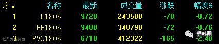 导读:今日塑料相关品种期货继续回落,LL1805、PP1805及V1805高开后震荡下行,其中LL1805收盘跌70至9720,跌幅在0.72%;PP1801跌72至9408,跌幅0.76%;V1805跌1