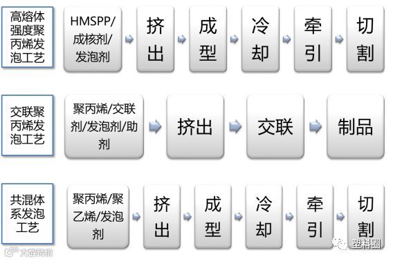 发泡聚丙烯主要有三种制备工艺:高熔体强度聚丙烯发泡、交联聚丙烯发泡、共混体系发泡工艺。