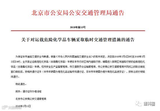 自2018年3月1日0时至2018年3月22日24时,北京将全天禁止运载危险化学品(含剧毒化学品)车辆在北京市行政区域内道路行驶。