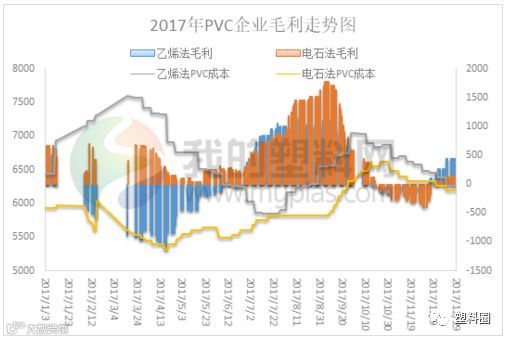 2017年国内PVC企业盈利状况总体向好,特别是自备电厂的一体化企业一直处于盈利状态。对外采电石企业来说,仅在10月底至11月底出现亏损。
