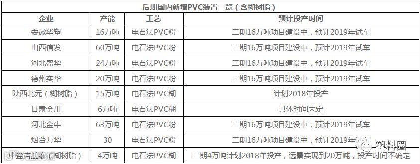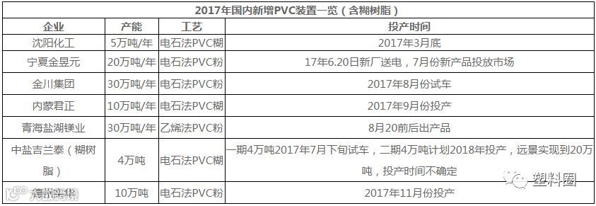 2017年国内PVC企业新上项目多半是延续资源成本产业链的一体化前期规划,产能投放也比较有序,其中青岛海晶自去年涉及搬迁以来,在2017年产品正式投放,正式冲击市场。基本集中在下半年6-8月份相对集中。主要是以宁夏金昱元、甘肃金川、中盐吉兰泰等为企业装置扩产所体现。