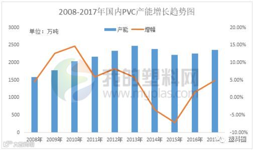国内PVC行业产能在2013-2015年经历去产能后产能过剩局面有较大改善,产业步入了真正的成熟周期。截至2017年年底,国内PVC在产企业产能统计在2362万吨(含糊树脂),较去年增加109万吨。