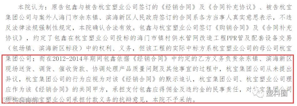 杭宝塑业公司是杭宝集团公司的子公司,该工程的实际中标方系杭宝塑业公司的母公司杭宝集团公司;而在2012-2014年期间包鑫依据《经销合同》中约定的乙方义务负责余东镇、滨海新区现场送货、调货、催收货款、协调处理产品质量问题及其他事宜的过程中,杭宝集团公司从未提出异议,杭宝集团公司的行为应视为对该《经销合同》的默示追认,最终法院认定浙江杭宝集团公司、杭宝塑业公司应作为《经销合同》的共同甲方,判处被告浙江杭宝集团有限公司、杭州杭宝塑业有限公司于判决生效之日起十日内支付原告包鑫佣金934095.79元,并于十日内支付原告违约金5万元整。