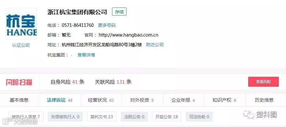近日,杭州市余杭区人民法院审理了一起合同纠纷案,被告浙江杭宝集团有限公司、杭州杭宝塑业有限公司因各种理由拖欠原告93余万元佣金被原告包鑫告上法庭。据悉,浙江杭宝集团有限公司正在申请破产清算,目前母公司被执行案件7起,关联公司负面信息131条,自身负面风险信息41条。
