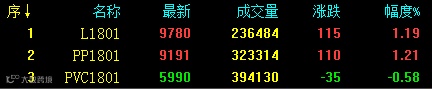 今日塑料相关品种期货走势出现分歧,其中PE和PP期货午后多头持续发力震荡收涨,连塑1801收盘涨115至9780,涨幅在1.19%;PP1801收涨110至9191,涨幅在1.21%。PVC期货方面空头增仓明显,于午后震荡收跌,V1801收盘跌35至5990,跌幅在0.58%。