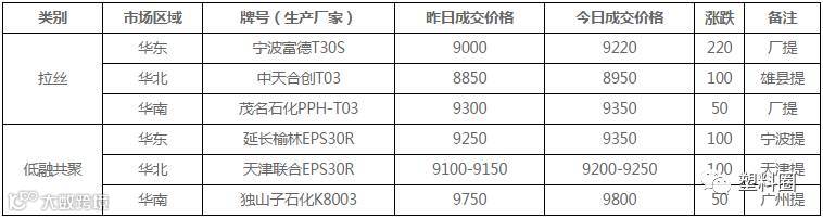 价格方面,拉丝主流价格在8950-9250元/吨;低融共聚主流价格在9200-9800元/吨不等。
