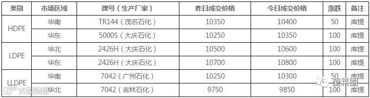 下一交易日国内PE市场价格延续涨势,涨幅在50-100元/吨。LLDPE主流市场价格在9850-10300元/吨,LDPE主流市场价格在10000-10600元/吨,HDPE膜主流市场价格在9750-10400元/吨。