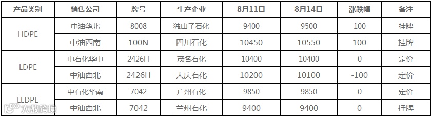 8月14日国内PE出厂价格调整(单位:元/吨)