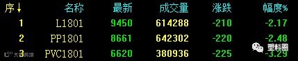 节前提保,商品全线下挫,能化领跌各期货品种。今日塑料相关品种期货大幅下跌,其中V1801早盘仅差5个点跌停。L1801、PP1801跌逾2%,PVC1801跌逾3%。