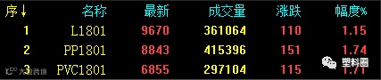 塑料期货延续涨势,其中PP1801减仓上行收取三连阳,成功站上60日均线。L1801收涨1.15%,PP1801收涨1.74%,PVC1801收涨1.71%。