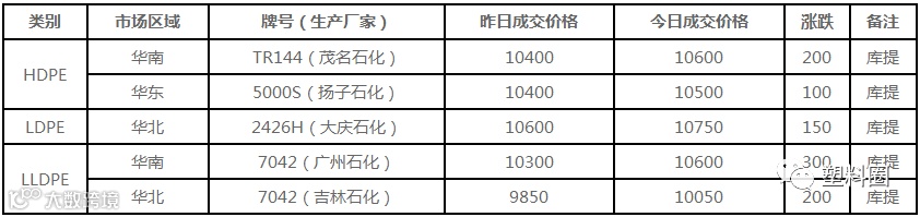 LLDPE主流市场价格在10050-10600元/吨,LDPE主流市场价格在10300-10850元/吨,HDPE膜主流市场价格在9900-10600元/吨。