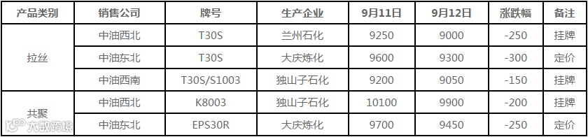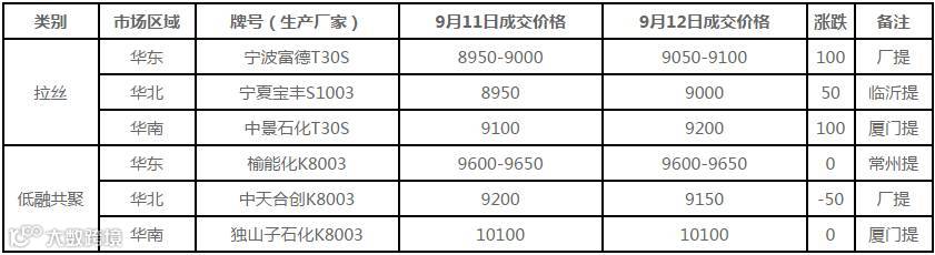 拉丝主流价格在9000-9500元/吨不等;低融共聚主流价格在9150-10100元/吨不等。
