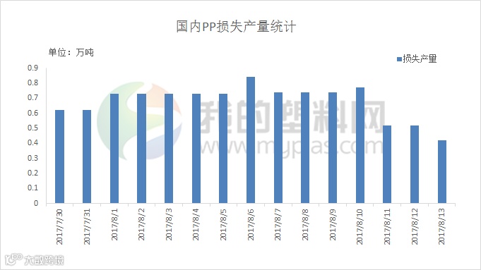 上周国内PP市场损失产量约在4.55万吨,较前一周5.11万吨减少0.66万吨。