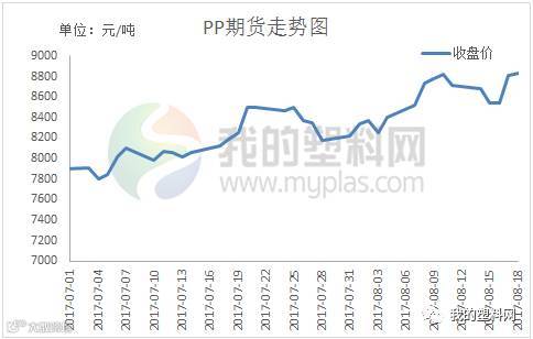 本周国内PP期货主力1801合约止跌反弹。具体来看,周初开盘价在8726元/吨,周五收盘8837元/吨,最高8854元/吨,最低8450元/吨,周涨123元/吨或1.41%。成交量减少至27.81万手,持仓量减少至42.50万手。