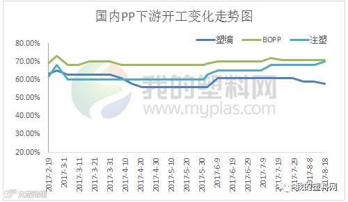 截止8月18日当周,国内聚丙烯下游行业开工率较上周有所调整。其中塑编行业开工率下降至58%左右,共聚行业开工率在上升至70%,BOPP行业开工率在71%左右。