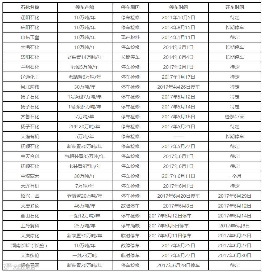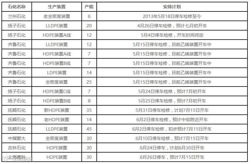 本月国内PE装置检修统计