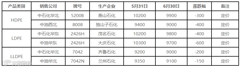 本月国内PE出厂价格调整(单位:元/吨)