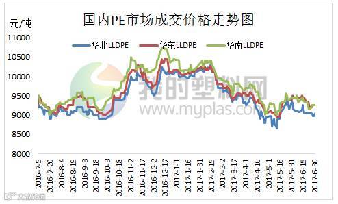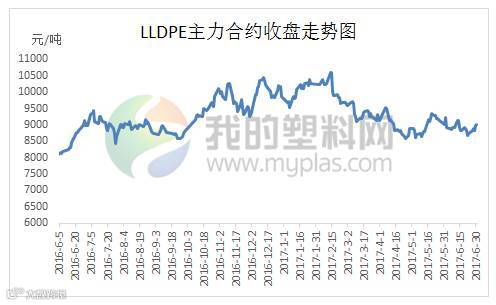 本月大商所连塑主力合约L1709波动不大,截止到6月末收9025元/吨,成交量31.4万手,持仓量40.2万手。