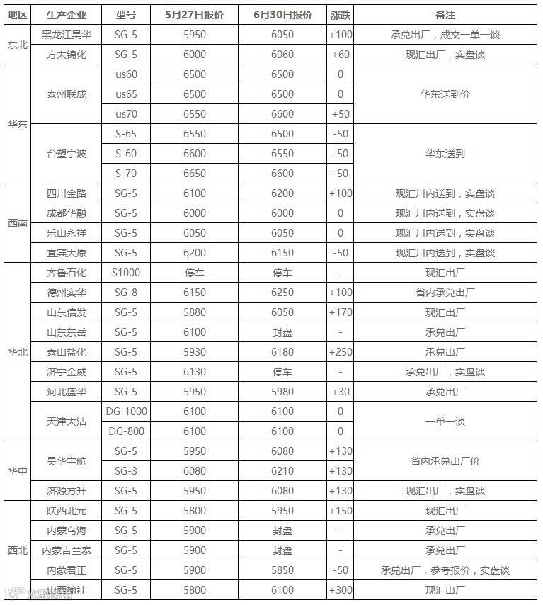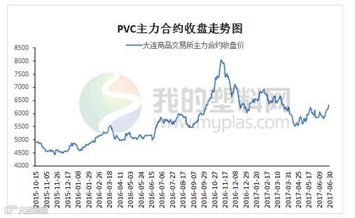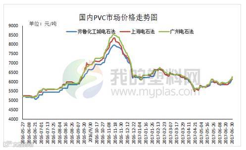 6月份国内PVC市场价格跌后反弹,月底出现连涨,整体涨幅在100-300元/吨。月初至月中V1709期货大起大落后表现出较强的抗跌性,现货市场商家对后期下游需求不甚乐观,出货多随行就市,部分积极套现下出现小跌。自20日开始,V1709期货触底反弹,开始向上突破,虽然初期并未拉动市场氛围,商家对后市仍显谨慎,但随着市场供应短缺等利好被不断放大,期货价格继续走高,接连突破上涨,下游企业询盘增多,市场炒涨氛围浓厚,企业封盘现象较多,市场报价连续走高,成交较好。截至本月底河北市场普通5型料主流6020-6070元/吨送到;山东市场5型料主流6080-6200元/吨送到;华东市场普通5型料自提报价6200-6330元/吨;华南普通5型电石料主流报价6320-6350元/吨自提。