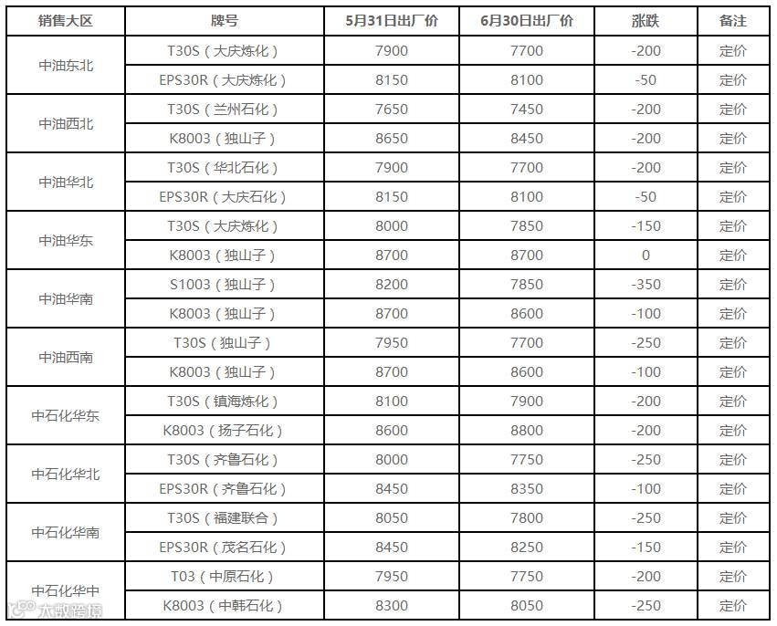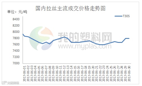 本月国内PP成交价格下跌后反弹。截6月30日,国内拉丝主流成交价格在7550-7950元/吨,较上月走低300-400元/吨不等;低融共聚价格在8000-8700元/吨,较上月走低100-200元/吨不等。