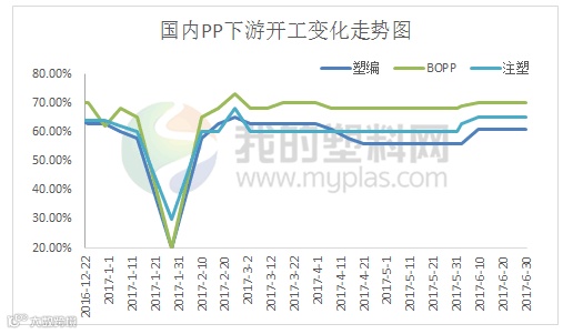 本月国内聚丙烯下游行业开工率小幅抬升。截止到本月末,其中塑编行业开工率在 61%左右,共聚行业开工率在65%,BOPP行业开工率在70%左右。生产企业新增订单有限,工厂正常生产为主,采购以低价货源为主。原料采购方面仍维持刚需采购,小厂备货周期维持在3-7天。