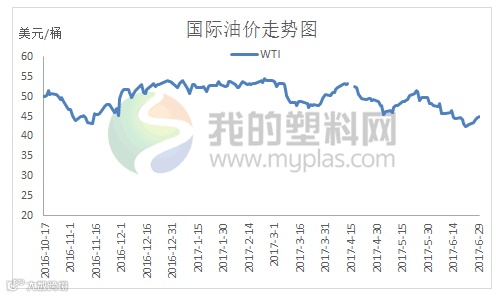6月份国际原油价格整体呈现单边下滑态势,下旬开始则筑底反弹,但回暖力度不及跌幅。延长减产会议开启了油价下行的势头,仅延长减产期限而未加大减产份额令市场失望,悲观情绪蔓延。美原油库存下降不及预期和产量上涨,包括利比亚复产均施压油价,需求端疲软迟迟未见改观,众多利空消息下油价一度跌落43美元/桶关口,随后技术性调整和空头回补令油价开始反弹,特别是美原油产量因暴风袭击而下降10万桶/天更是加速反弹力度,月末油价迈上45美元/桶。
