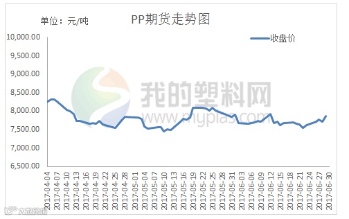 本月国内PP主力1705合约宽幅震荡。具体来看,月初开盘价在7860元/吨,6月30日收盘7848元/吨,最高7960元/吨,最低7534元/吨,月涨551元/吨或0.70%。成交量减少至35.25万手,持仓量减少至62.36万手。